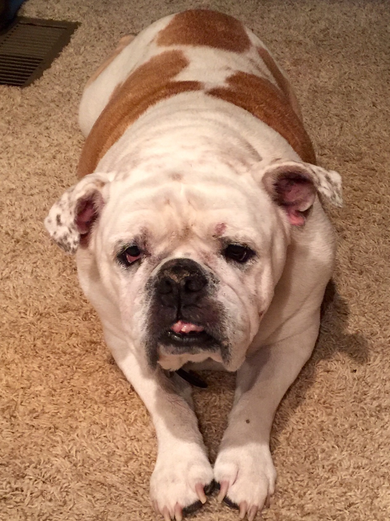 The dog in question is a 10-year old bulldog named Remy. She just loves to be petted and is a noisy breather. She also snores when she sleeps, which is often considering her age.