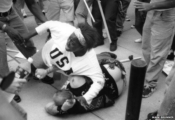There is a powerful photograph floating around the interwebs. It shows a young black woman shielding a young white man from attackers.