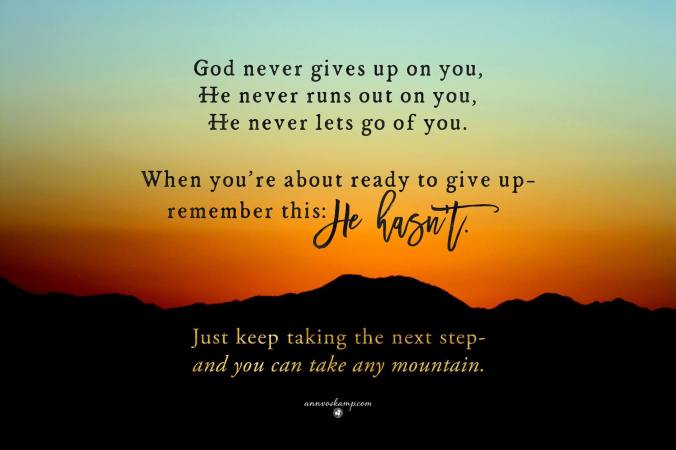 He Hasn’t May 10, 2017 / Ragamuffingospelfan The writer’s block continues, so here’s something I posted on social media on this day last year. God hasn’t given up on you, so neither should you. Share this:Share Click to share on Facebook (Opens in new window) Facebook Like Loading...