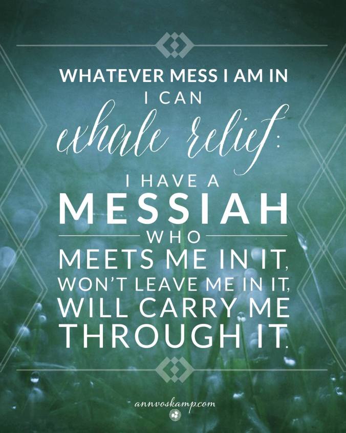 Whatever mess I’m in, Jesus will carry me through it. He won’t, as a pastor once said, pick me up and toss me over to the other side of it. He will go through it with me. He will carry me through it.