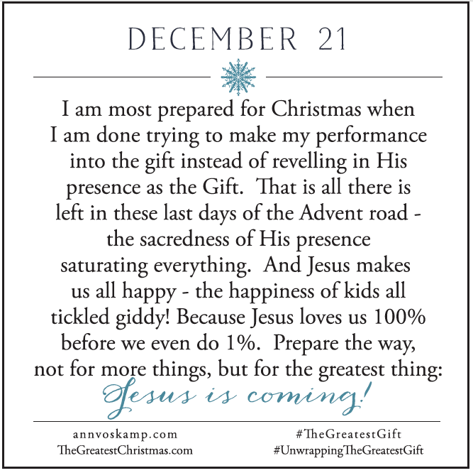 Maybe in the few days left till Christmas, you can choose not to obsess over what gifts you will give. Maybe spend more time relishing in that one Gift that you have already received, and will receive again. Jesus is coming!