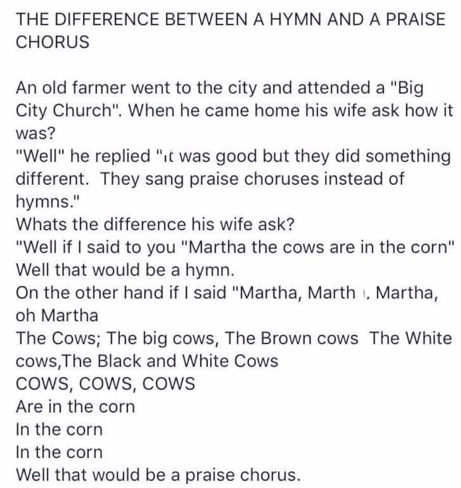 The Difference Between a Hymn and a Praise Chorus August 16, 2019 / Ragamuffingospelfan Oh, c’mon. You know it’s funny. Share this:Share Share on Facebook (Opens in new window) Facebook Like Loading...