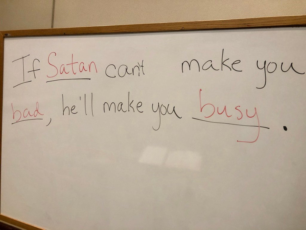 It’s a good word. If Satan can’t make you bad, he’ll make you busy. He’ll get you to screw up your priorities so that productivity becomes more important than people, and getting things done becomes more important than making a difference in your world.