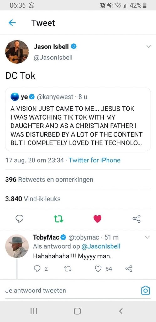 Basically, Kanye West is fed up with some of the content of Tik Tok and wants to start a new app called Jesus Tok. But I prefer Jason Isbell’s idea of calling it DC Tak.
