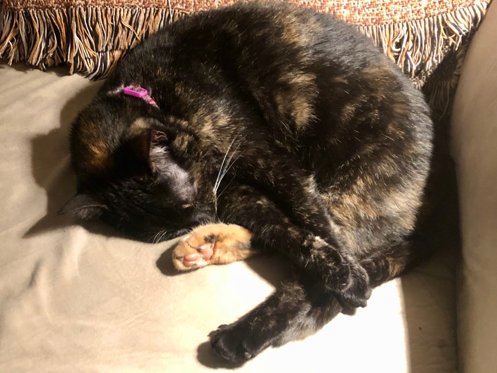 Judging by the picture, I think she’s rather fond of that mismatched foot. Plus, what is more peaceful and stress-relieving that a sleeping cat?