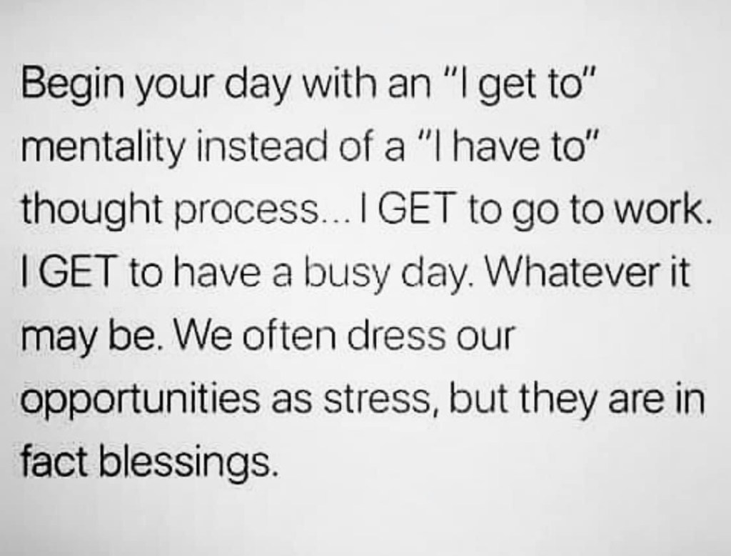 But what if I took those “have-to”s and saw them as “get-to”s? I get to go into work tomorrow because I still have a job. I get to drive 25 miles because I have a car that works and is reasonably comfortable if not overly stylish. I get to eat my veggies because I’m blessed that I don’t have to worry about where my next meal is coming from (or if it’s coming at all).