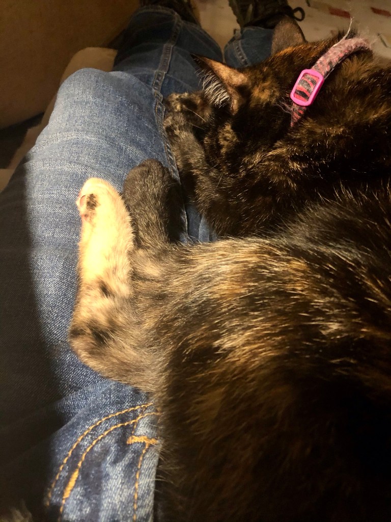 But it’s nice to have some feline company, no matter what the occasion. She’s never one to talk my head off or to be obnoxious. Mostly, she curls up in my lap and falls asleep.