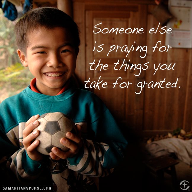 My car is old, but I have a car. It’s mostly reliable. I can afford to put gas in it and go places, like to my job. And I have a job so I can pay for things like gas for my car and other stuff. So many people around the world are praying for what I take for granted on a daily basis. So many people would love to have one of my bad days, because my bad days would be an improvement over their best days.