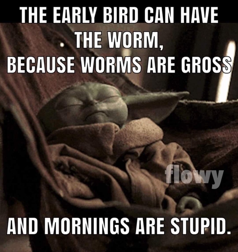 I 100% endorse this message. If I could skip mornings and still manage to have a full day, then I completely would. Thankfully, there’s coffee and memes like this one to help me cope with the inhumanity of early mornings.