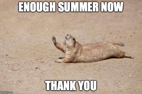 I don’t know if that’s a prairie dog or not, but I feel its pain. I, too, am ready to see hot sweaty weather go away for a while. I actually don’t mind summer. I don’t mind hot weather — if it’s a dry heat. What I despise is sticky hot weather that turns me into a smelly sweaty mess.