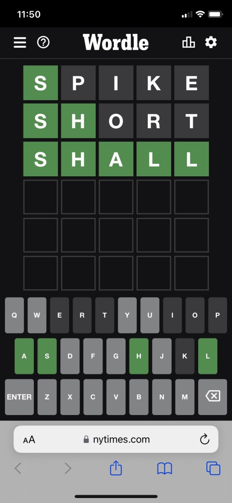 On this one, I literally entered the first word I could think of that fit within the letters I already had. I honestly wasn’t expecting to get all the letters — one or two would have been nice. But it is a good feeling to see all the letters turning green. That never gets old.
