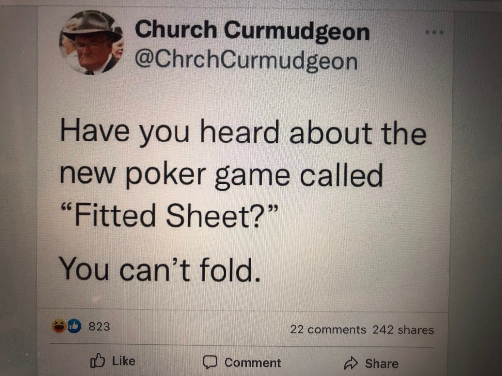 A Little Rainy Wednesday Humor April 13, 2022 / Ragamuffingospelfan In case you needed a joke to brighten up your day, here’s one. Especially on a day like today with all the rain. Share this:Share Share on Facebook (Opens in new window) Facebook Like Loading...