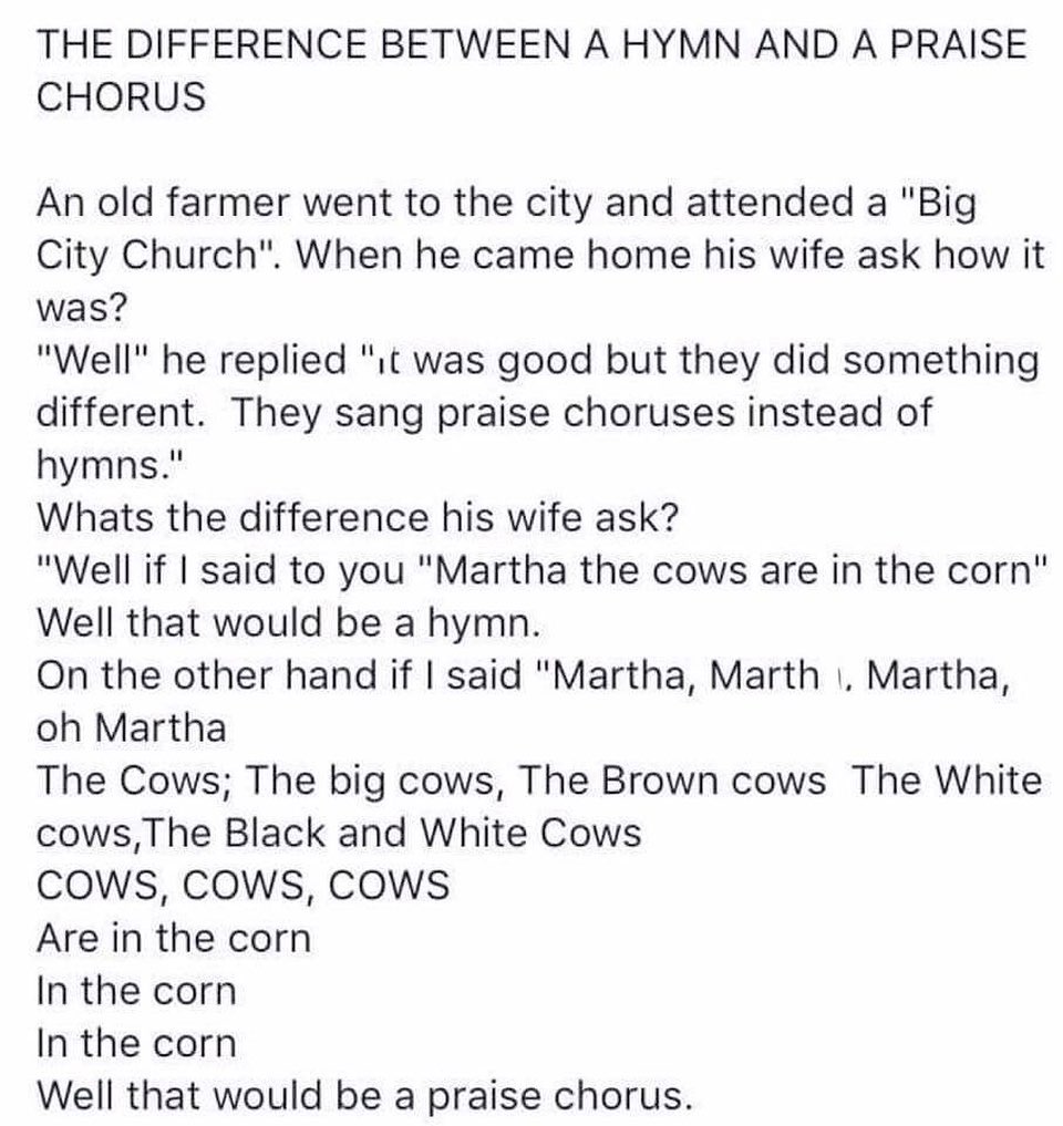 The Difference Between A Hymns and A Praise Chorus August 14, 2022 / Ragamuffingospelfan Just to be clear, I like ’em both. I just thought this was funny. And somewhat accurate. Share this:Share Share on Facebook (Opens in new window) Facebook Like Loading...