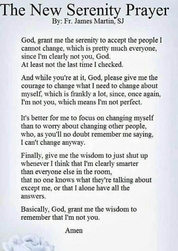 The old Serenity prayer goes something like God give me the serenity to accept the things I can’t change, the courage to change the things I can, and the wisdom to know the difference. I think I might like the new version a bit better.