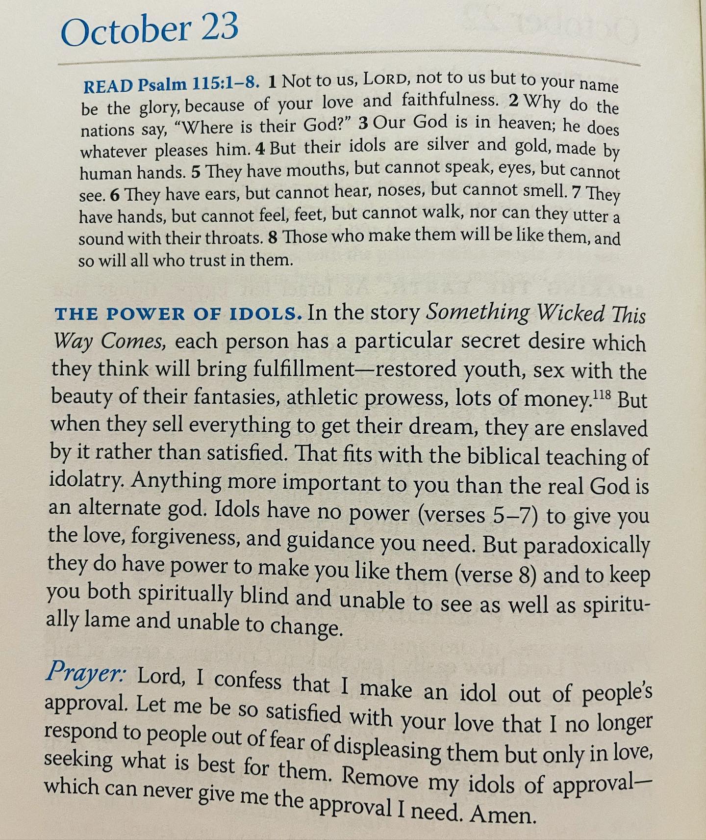 But an idol is anything we value above God, anything that we give more time and attention to than we give to God. Idols can be just about anything from careers to children, from money to marriage, from status to sex. It can be the need for approval and affirmation. It’s often taking something that started out as good and expecting it to be a god, functioning in the true God’s place.