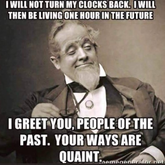 So apparently daylight savings ends on Sunday, November 6 at 2 am. I’m pretty sure whoever decided on that arbitrary time also decided to put the r in February and also chose Wednesday instead of Winsday.