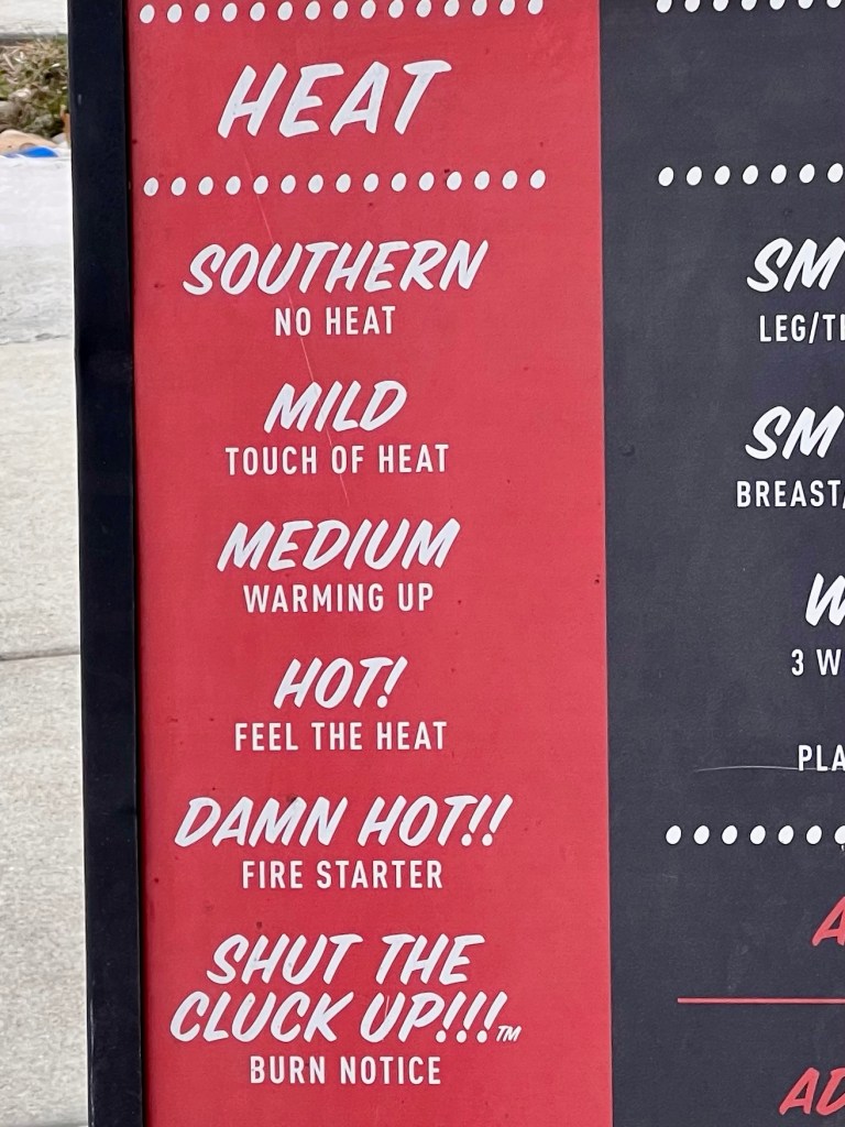 I have become a bit of a connoisseur of hot chicken. I like it with a bit of a kick but again not where all I can taste is hot. I have yet to go beyond the medium level of spicy. I really have no desire to go to the point of spicy to the point of cussing, if you catch my drift.