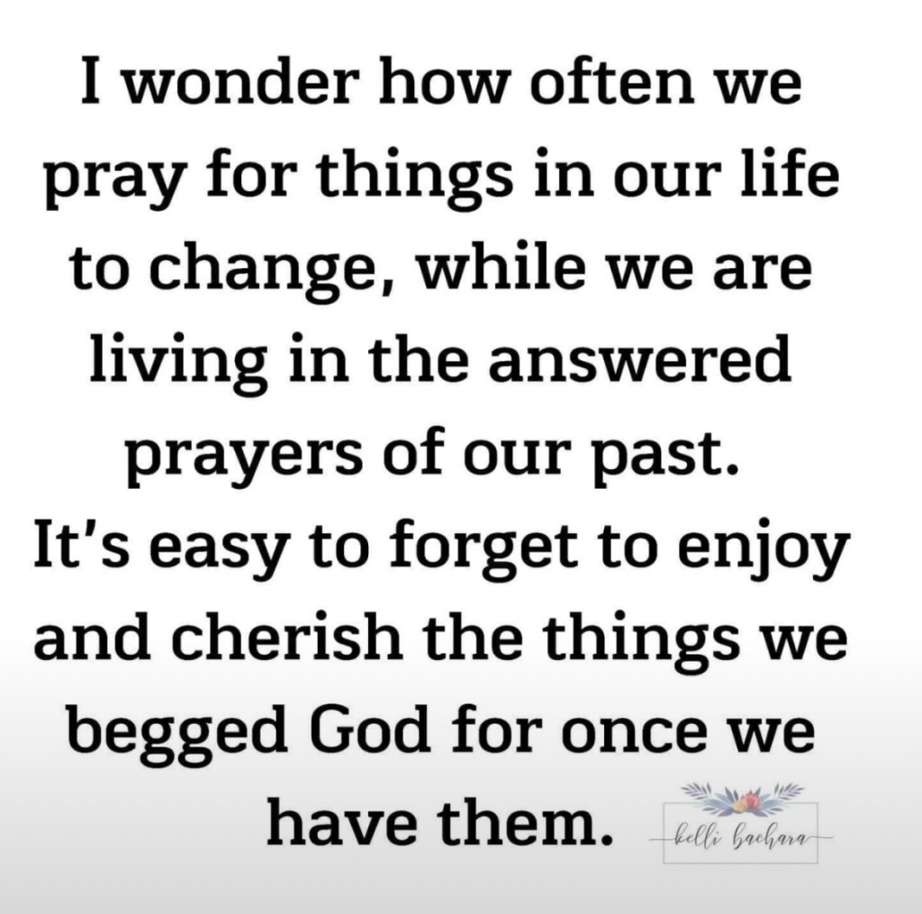I keep praying for change, forgetting that I am living in the answered prayers that I prayed just as earnestly for but failed to recognize when God actually answered them. I point the finger at God, wondering why He doesn’t act while I have amnesia about all the previous blessings He’s given me.