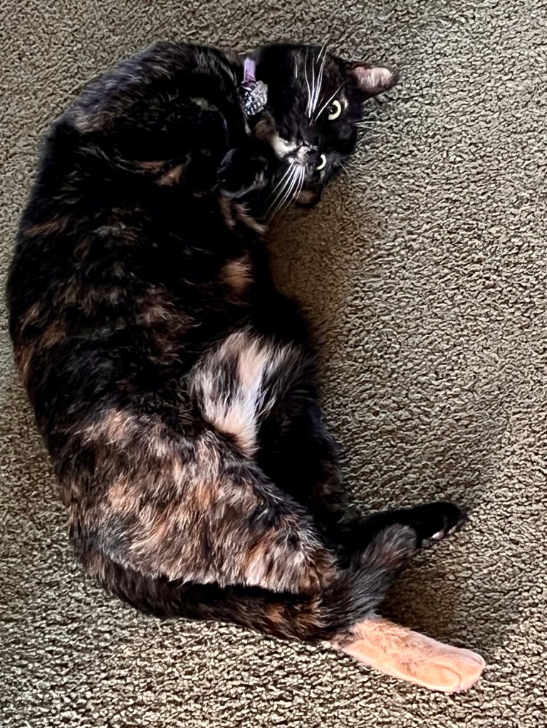 This picture captures the essence of Peanut quite well, I think. Even though it’s a bit blurry, it shows how she loves to roll over on her back and wait for the inevitable belly rubs to begin. She’s one of the rare felines who will actually accept people petting her belly without taking a pound of flesh. She even sometimes purrs.