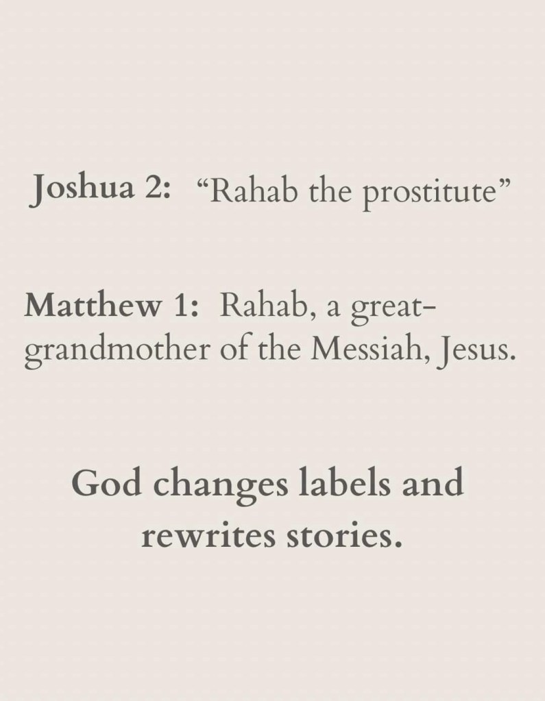I can’t think of too many more powerful examples of the transformative grace of God than Rahab. She literally was a prostitute who chose the promises of God over her own people.