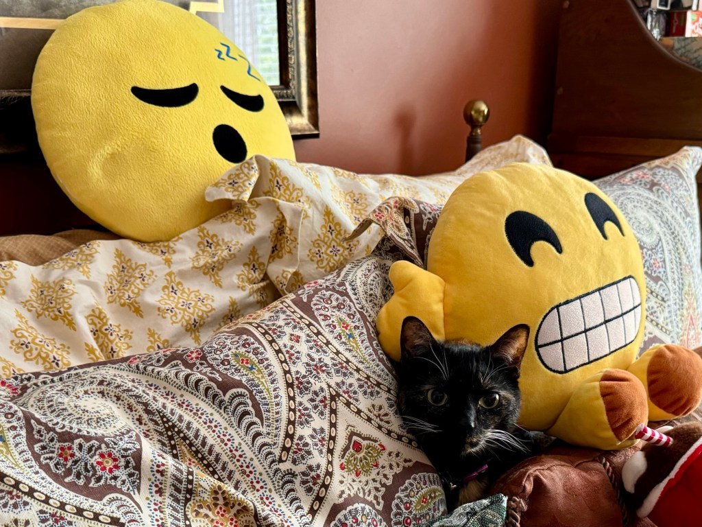 I say hide and seek world champion, but that’s only in her mind. She thinks that if she can’t see you, you can’t see her. But usually there’s the telltale lump under the bed covers that gives her away. Or it’s all the pillows from my bed knocked askew.