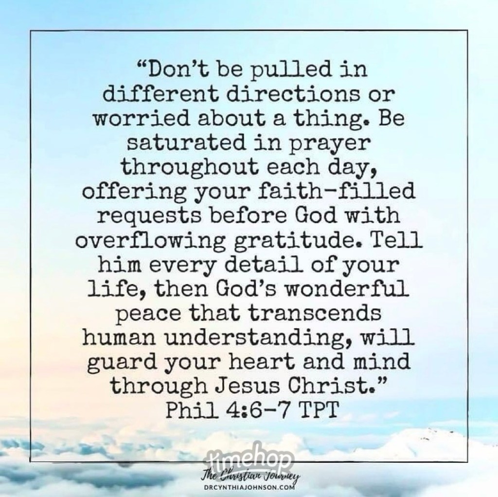As I heard Sunday, sometimes it’s best to let the Word do the work. With that said, I have very little to add to this Scriptural admonition other than I’d be wise myself to follow it and not just post it. Don’t worry about anything but pray about anything. As I heard it said, be a prayer worrier not a panicked worrier.