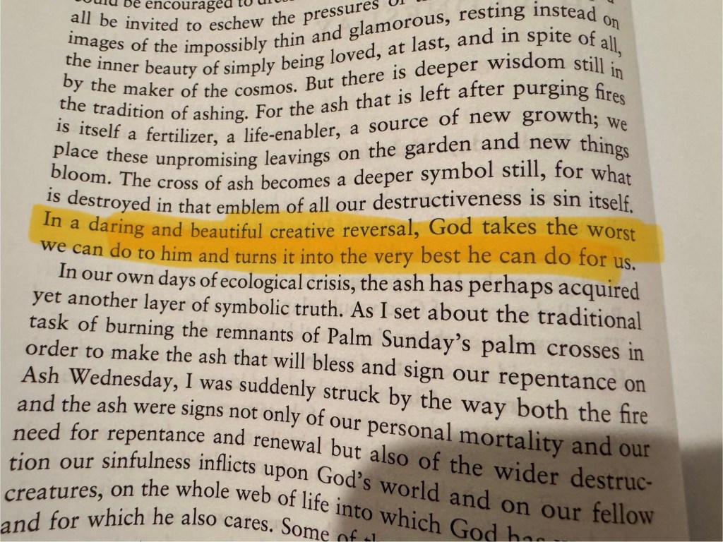 The author, Malcolm Guite, talks about how the ashes from Ash Wednesday represent mourning and loss as typified by how the ancient people used to express grief by tearing their garments and pouring ashes on their heads. Guite also mentions that ashes can be used for fertilizer in a garden to bring new life.