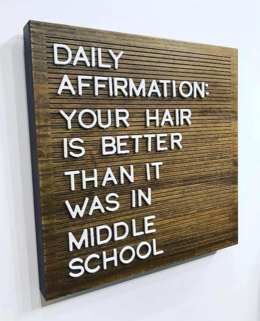 So take that as your daily affirmation. Your hair is better now than it was then. Even if you don’t have hair anymore, it’s still a better look than the awkward 6th grade school photo hair you had back when. Not to mention the questionable fashion choices you made (or more likely your mother made for you).