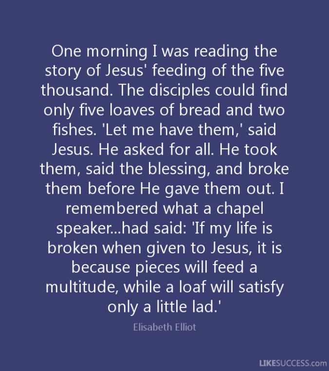 To be broken means that God can use our lives, our very selves, to minister to many more than we could have dreamed of had we remained whole. Most likely, we would have remained self-reliant, self-seeking, self-focused, never really acknowledging our deep need for God.